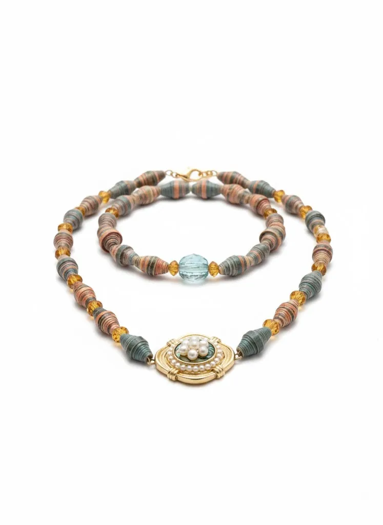 Artisan-Halskette „Vintage Soul“ Titel: Handgefertigte Statement-Kette mit Papierperlen & antikem Medaillon Diese Halskette ist ein wahres Kunstwerk für Individualistinnen. Sie kombiniert traditionelles Handwerk mit edlen Akzenten und erzählt durch ihren Materialmix eine ganz eigene Geschichte. Ein absolutes Highlight ist das zentrale, goldfarbene Medaillon, das mit zarten Perlen besetzt ist. Einzigartiger Materialmix: Die Kette besteht aus kunstvoll gerollten Papierperlen in erdigen Blau- und Terrakottatönen, ergänzt durch funkelnde bernsteinfarbene Glasakzente. Zentrales Vintage-Element: Ein prachtvolles, goldfarbenes Medaillon mit Perlenbesatz dient als eleganter Blickfang im Dekolleté. Farbspektrum: Harmonische Erdtöne treffen auf kühles Blau und warmes Gold – eine Palette, die zu jeder Jahreszeit passt. Nachhaltiger Charme: Die Verwendung von Papierperlen verleiht der Kette nicht nur ein geringes Gewicht für hohen Tragekomfort, sondern auch eine besondere, handwerkliche Note. Stil-Tipp: Diese Kette braucht Raum, um zu wirken. Sie passt hervorragend zu unifarbenen Oberteilen in Weiß, Beige oder Dunkelblau. Kombinieren Sie sie mit schlichten goldenen Ohrsteckern, um den Fokus ganz auf das detailreiche Medaillon zu lenken. Produktdetails: Material: Handgerollte Papierperlen, Glasperlen, Metalllegierung (goldfarben), Kunstperlen. Verschluss: Stabiler Karabinerverschluss in Gold-Optik. Besonderheit: Da jede Papierperle von Hand gefertigt wird, ist jede Kette ein absolutes Einzelstück.