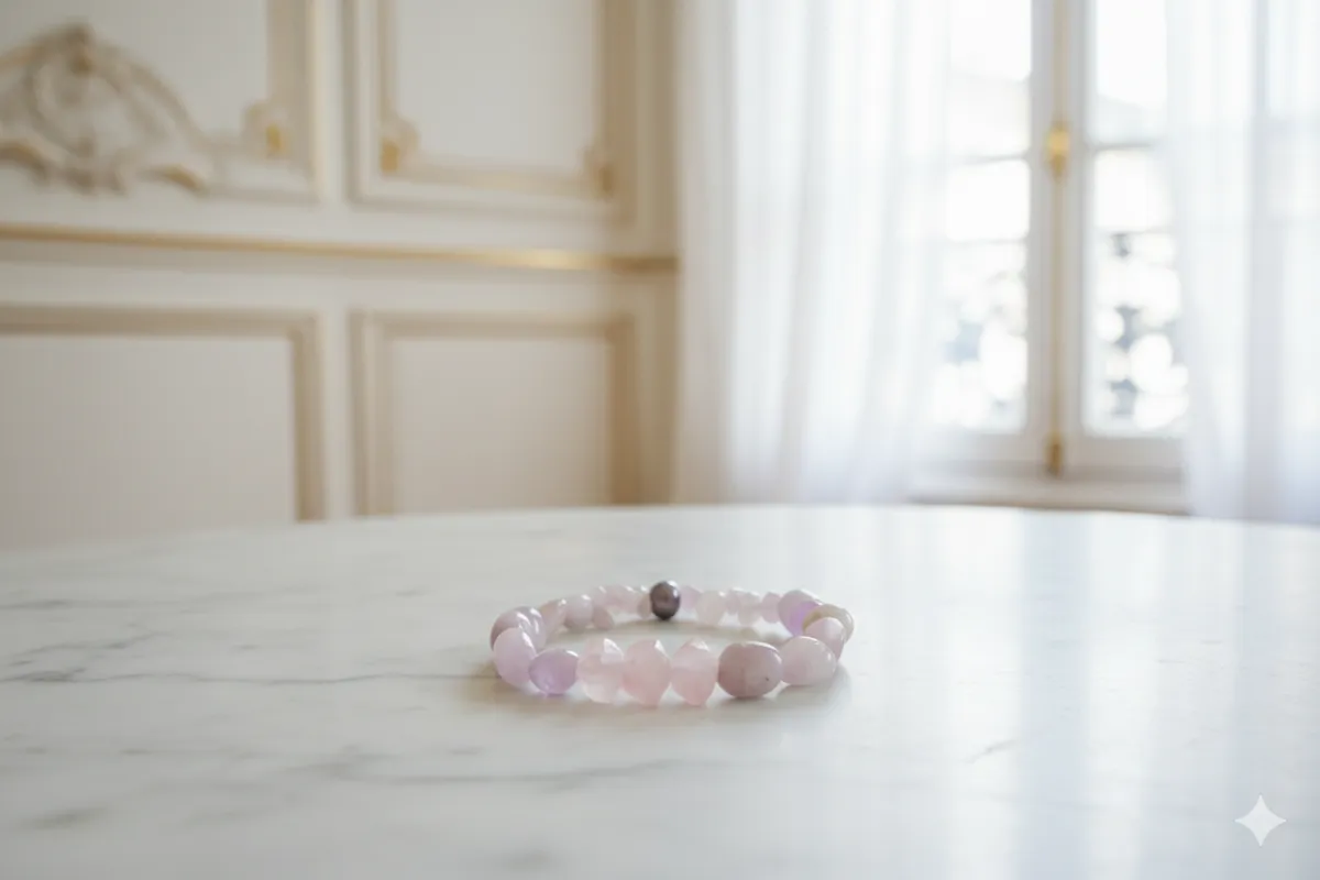 Rosée de Matin – Sanftheit und Licht Lassen Sie sich von der zarten Eleganz unseres Rosée de Matin Armbands verzaubern. Inspiriert von der Ruhe eines Pariser Morgens, fängt dieses Schmuckstück das weiche Licht des Tagesanbruchs ein und hüllt Ihr Handgelenk in eine Aura aus purer Romantik. Produktdetails Edelsteine: Eine harmonische Komposition aus facettiertem und glatt geschliffenem Rosenquarz sowie zartem Amethyst. Die sanften Pastelltöne in Rosé und Flieder strahlen Ruhe und Weiblichkeit aus. Akzent: Eine einzelne, kontrastierende dunkle Tahiti-Stil Perle bildet den Mittelpunkt und verleiht dem Armband eine moderne, edle Note. Formgebung: Die organisch geformten Steine verleihen dem Armband einen individuellen „Handmade“-Charakter, der perfekt zum luxuriösen Boho-Chic passt. Tragekomfort: Gefertigt auf einem hochwertigen Elastikband für maximalen Komfort und eine perfekte Passform im Alltag. Die Ästhetik Dieses Armband ist die perfekte Wahl für Frauen, die subtilen Luxus lieben. Die Kombination aus den heilbringenden Eigenschaften des Rosenquarzes (der Stein der Liebe) und der kühlen Eleganz der Perle macht es zu einem idealen Begleiter für helle, sommerliche Outfits oder als sanfter Akzent zu klassischer Business-Garderobe. "Ein Hauch von Poesie für Ihr Handgelenk – feminin, zart und zeitlos schön."