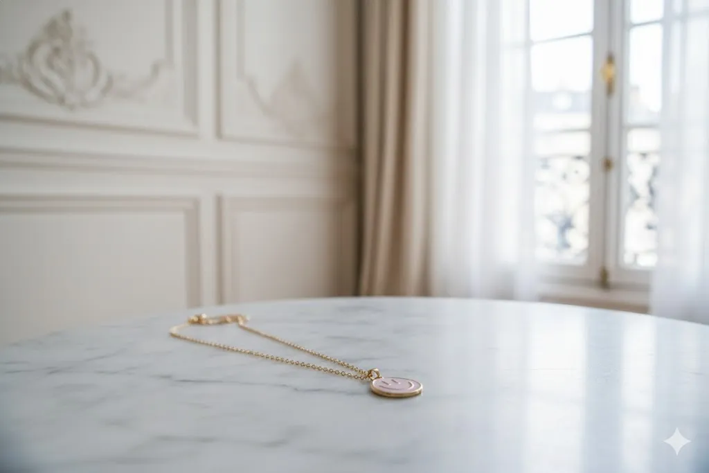 Smiley-Halskette „Joie de Vivre“ – Gold & Rosé Bringen Sie Luxus und Leichtigkeit in Ihren Alltag. Diese exklusive Halskette vereint verspieltes Design mit zeitloser Eleganz. Inspiriert vom unbeschwerten Lebensgefühl eines Pariser Frühlings, ist unser Smiley-Anhänger mehr als nur ein Accessoire – er ist ein Statement für Optimismus und Stil. Produktdetails: Design: Ein sanft geschwungener Smiley-Anhänger mit hochwertiger Emaille-Füllung in softem Pastell-Rosé. Material: Edle Gold-Optik mit Hochglanz-Finish, gefertigt für langanhaltenden Glanz. Stil: Minimalistisches „Haute Couture“-Design, das sowohl zum legeren Tages-Outfit als auch zum eleganten Abendkleid passt. Länge: Filigrane Ankerkette mit verstellbarem Verschluss für die perfekte Passform. Warum Sie sie lieben werden: Ob als täglicher Glücksbringer oder als besonderes Geschenk für einen Lieblingsmenschen – diese Kette strahlt pure Lebensfreude aus. Das Spiel zwischen dem warmen Goldton und dem zarten Rosé schmeichelt jedem Hauttyp und verleiht Ihrem Look eine subtile, luxuriöse Note. „Eleganz ist das einzige Beauty-Statement, das niemals verblasst.“